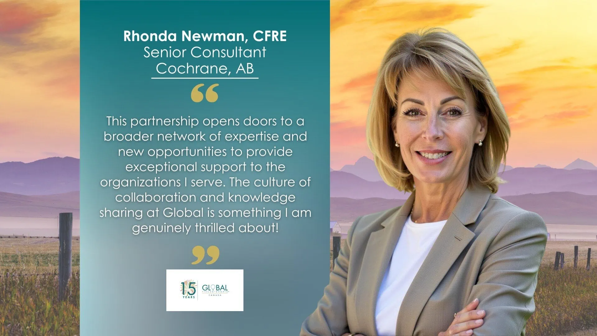 “I’m delighted to welcome Rhonda to the Global community,” states Guy Mallabone, CEO and President of Global Philanthropic Canada. “Her fundraising expertise, deep experience in Alberta, and passion for empowering non-profits to realize their potential will provide enormous benefit to our clients.”