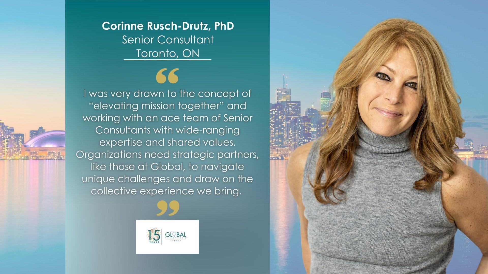 “It’s very exciting to be partnering with Global in service of such a broad range of non-profits. I was very drawn to the concept of “elevating mission together” and having an opportunity to work with an ace team of Senior Consultants who have such wide-ranging expertise, and shared values,” states Corinne. “This is a deeply uncertain time for the non-profit sector in Canada. There’s more need for social services than ever, and most communities face less funding and fewer funders than before. Organizations need strategic partners, like those at Global, to navigate their unique challenges and draw on the collective experience we bring. It’s gratifying to bring my sector knowledge and passion for finding innovative solutions to the table and work alongside other Globalites, supporting organizations to continue in their important work.”
